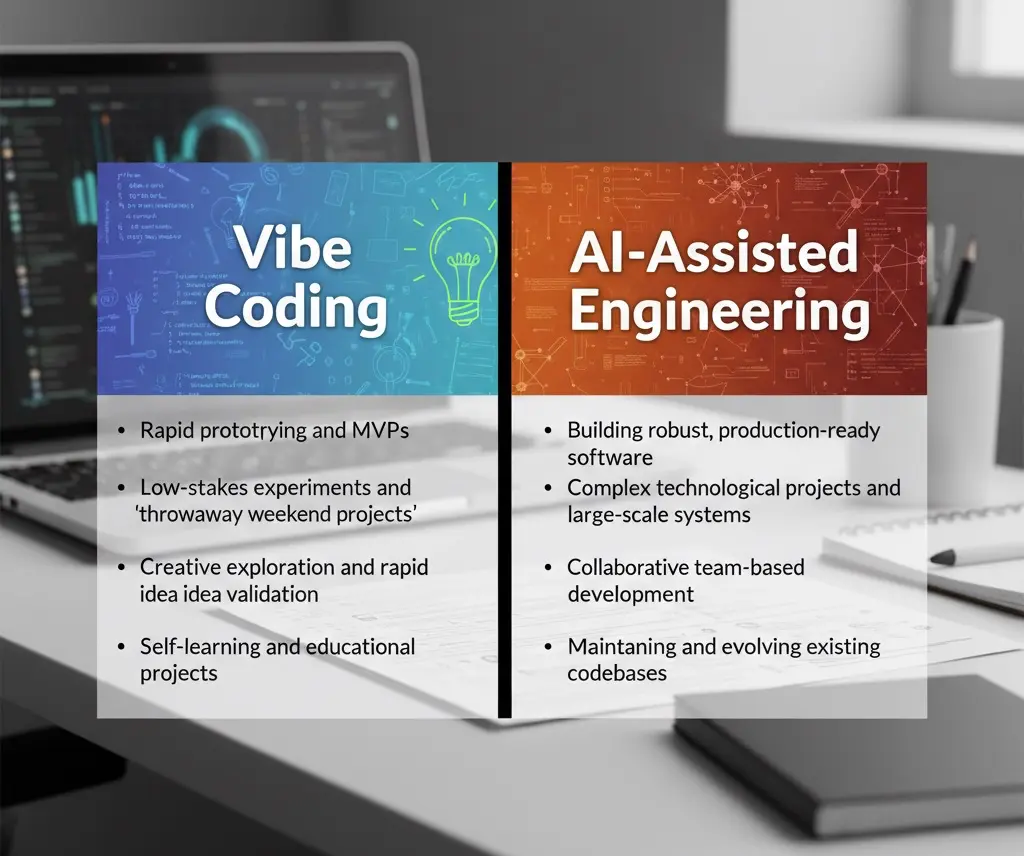 The most critical distinction for leadership to establish is the boundary between appropriate and inappropriate applications for each approach. Vibe coding is a powerful tool for ideation, while AI-assisted engineering is the framework for production.